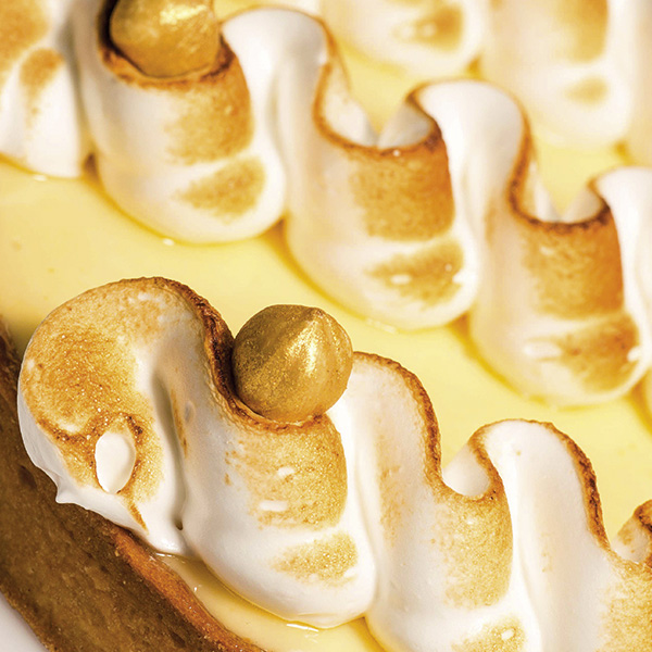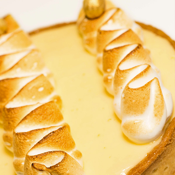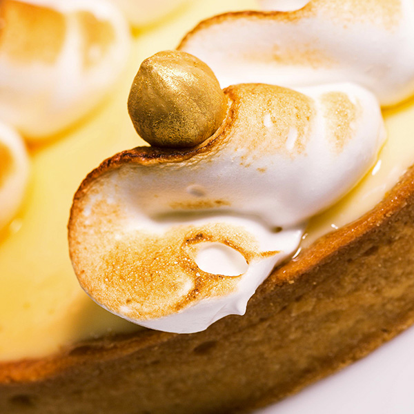Pâte sucrée, praliné croustillant à la noisette, crémeux citron et meringue.